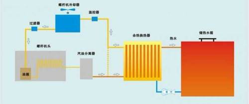 熱能回收裝置工作原理:空壓機的高溫油經(jīng)過熱交換器把熱量傳遞到冷卻水中,冷卻水被加熱后流到保溫貯水桶中,這樣就可達到熱能回收的目的。